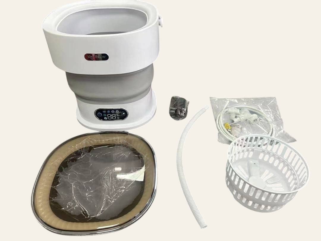Cette machine à laver portable mini pliable avec essoreuse, d'une capacité de 11 litres.